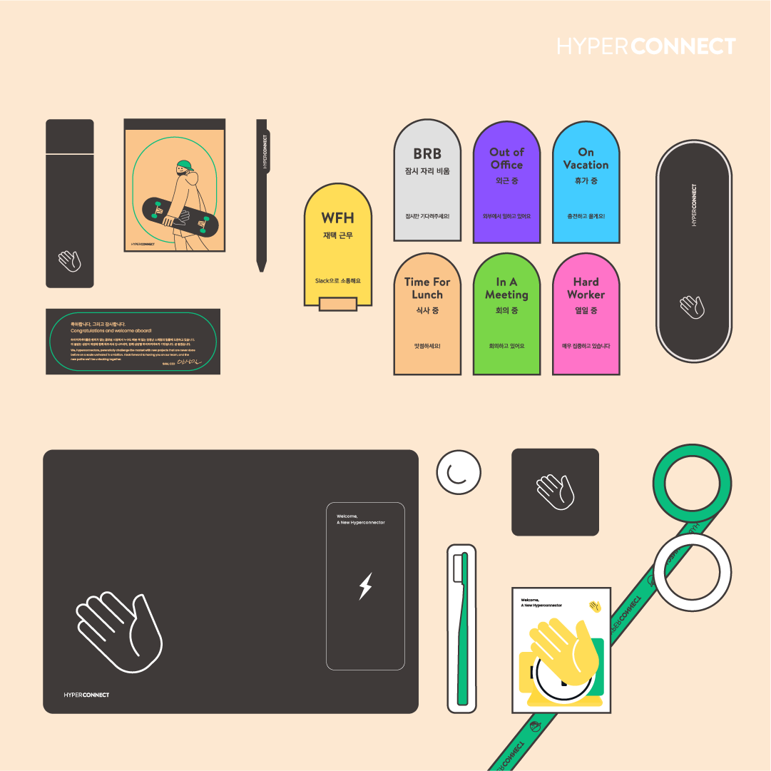 : 하이퍼커넥트®의 문화를 웰컴키트를 통해서도 직간접적으로 경험할 수 있게 디자인했습니다. 오피스 곳곳에서 만날 수 있는 역동적인 스케이터 캐릭터와 비비드한 하이퍼 그린 컬러를 통해, 재택근무를 할 때도 하이퍼커넥트®의 소속감과 문화를 느낄 수 있습니다.
