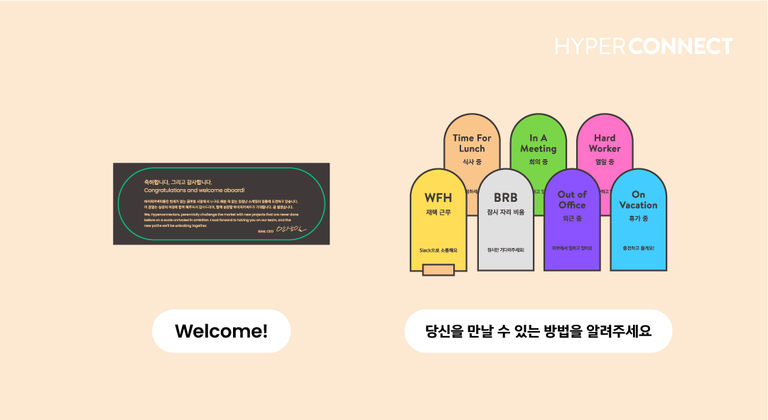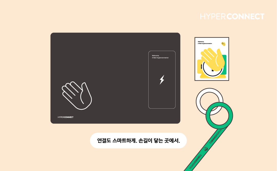 ‘하이퍼커넥트®’가 신규 입사자의 첫 출근을 책임지기 위해 고심해서 작업한 웰컴키트! 새로운 하이퍼커넥터의 입사 첫 날이 더 밝고 경쾌하게 시작되길 바라는 마음으로, 아래와 같은 하이퍼커넥트®의 특장점을 웰컴키트에 반영해 제작했습니다.