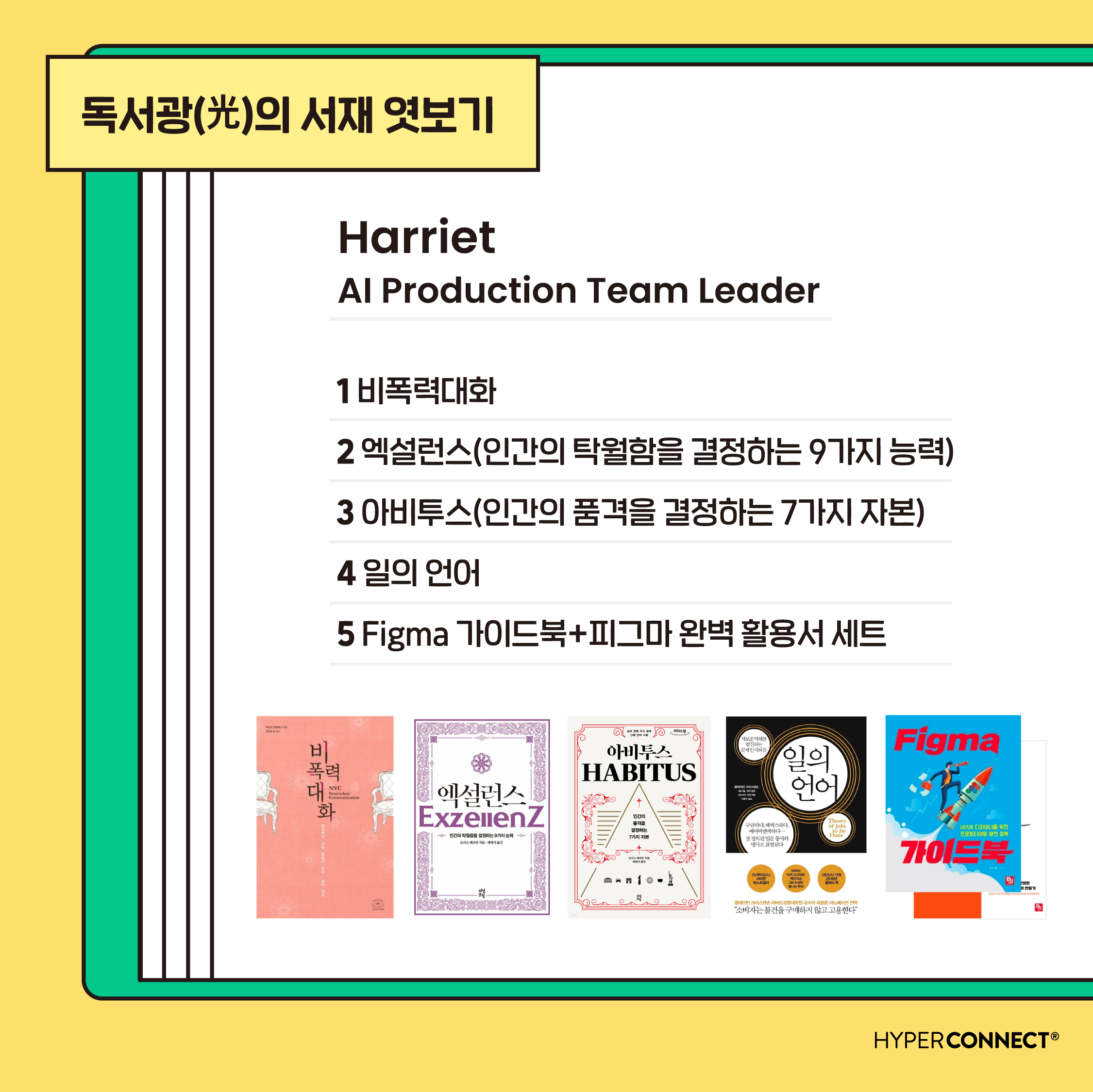 업무능력을 향상시키기 위한 <일의 언어>, <Figma 가이드북>과 함께 <비폭력대화>, <엑설런스>, <아비투스>등