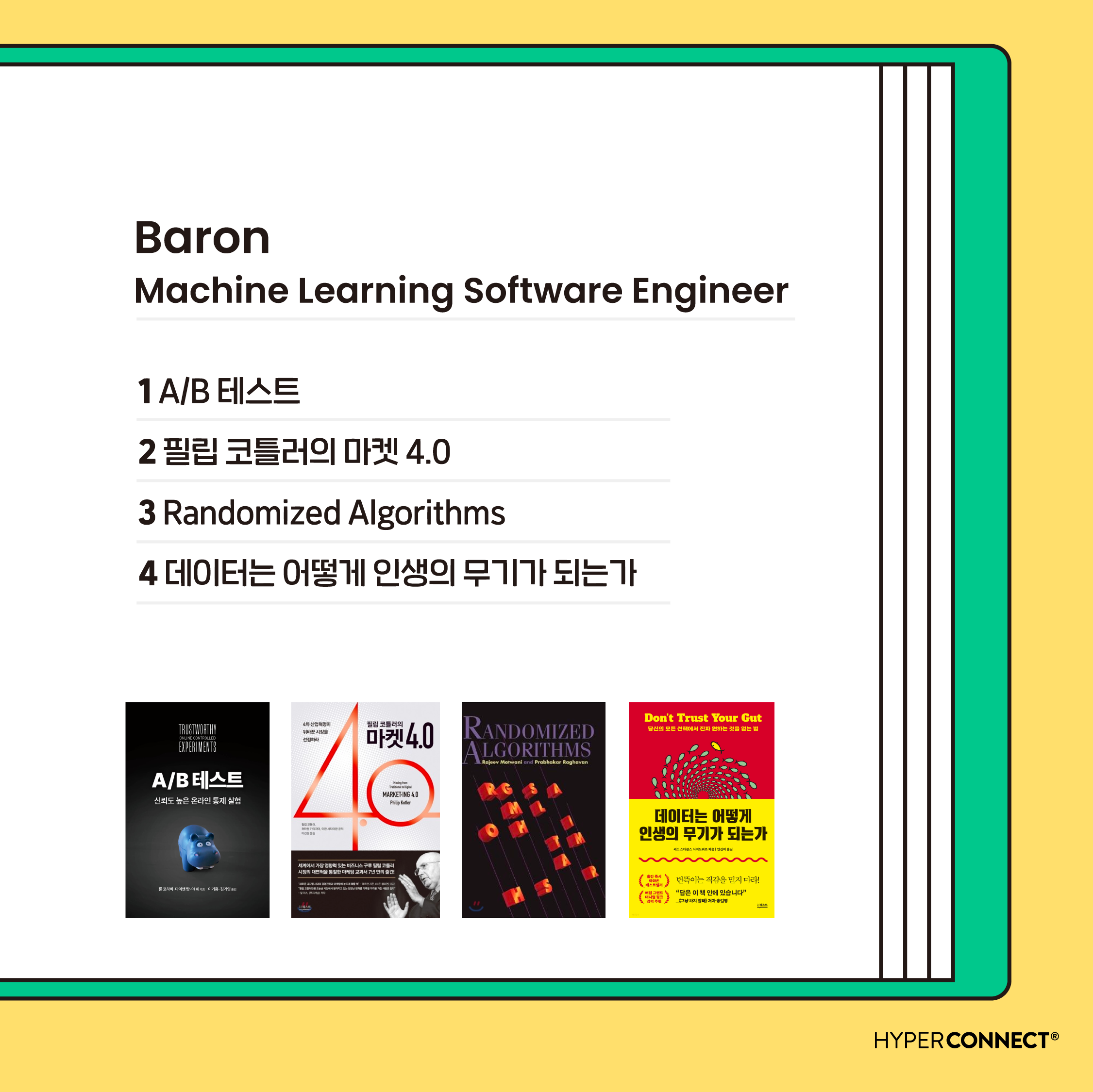 새로운 기능을 분석해보기 위해 A/B 테스트를 자주 수행하는데, A/B 테스트를 통해 얻은 결론이 신뢰할 수 있는 결과인지에 대한 의문이 항상 있었습니다. 동료분께서 <A/B테스트>라는 책을 추천해주셔서 읽어보았는데, 실험 결과가 통계학적으로 엄밀한 결과인지 확인해볼 수 있는 가이드를 제시해주어 많은 도움을 받았기에 추천드립니다. 또, 읽었던 책 중 <데이터는 어떻게 인생의 무기가 되는가>는 업무 뿐 아니라 일상에서도 도움이 될 만한 책이라 1독을 권장 드리고 싶네요.” - Baron